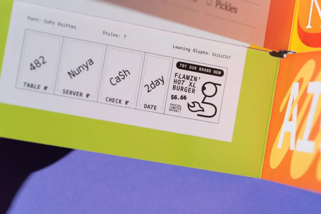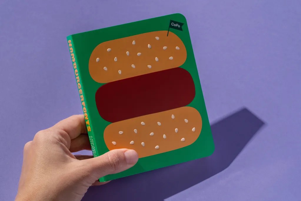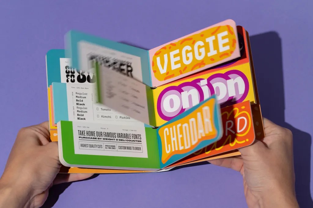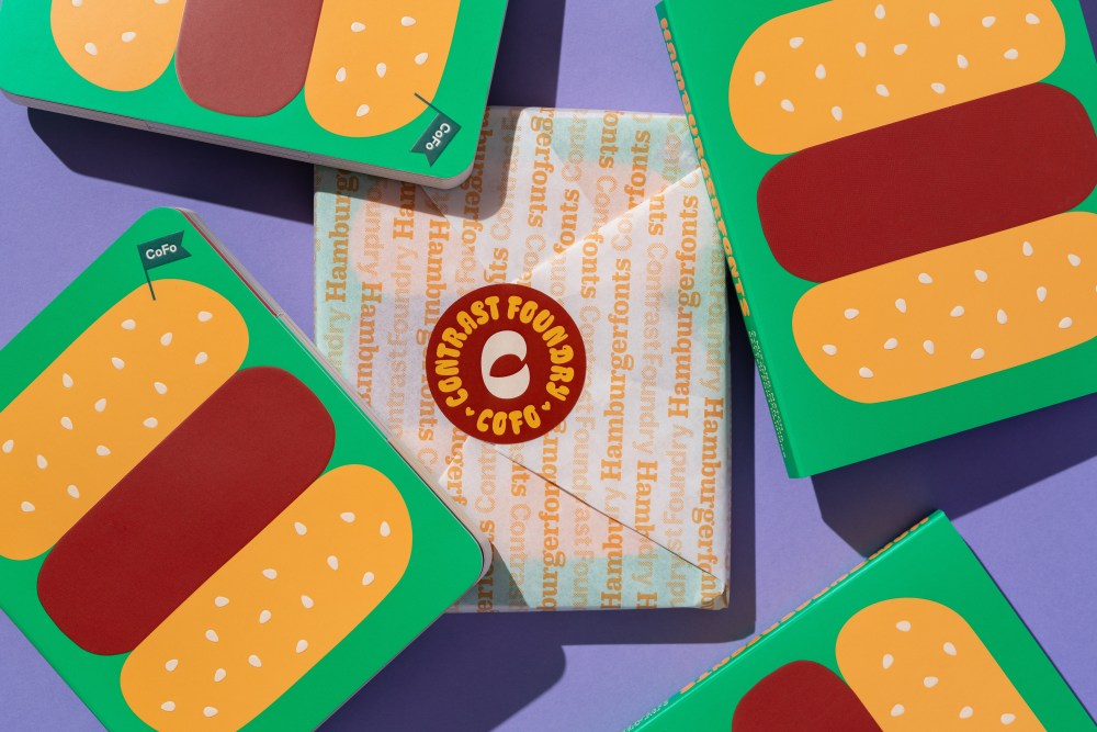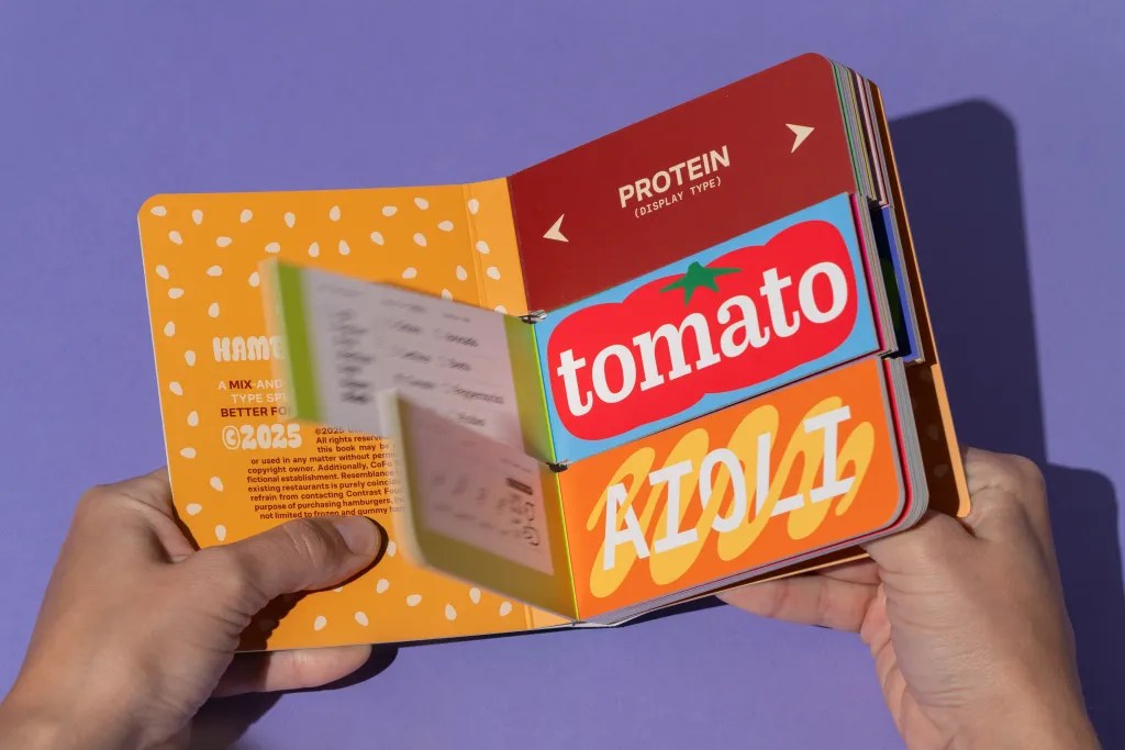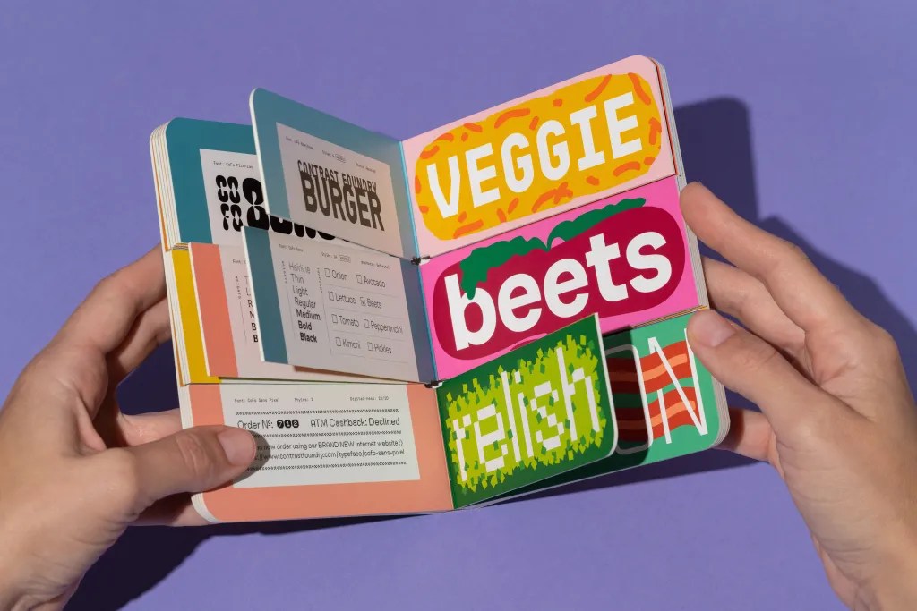 Bright and colorful illustrations, a collaboration between the TOOOT team and CoFo’s Egor Golovyrin and Nikita Sapozhkov, complement the typefaces. The burger story continues through the packaging, with the adorable, handheld-sized book presented in a burger-style wrap, enclosed with a sticker.