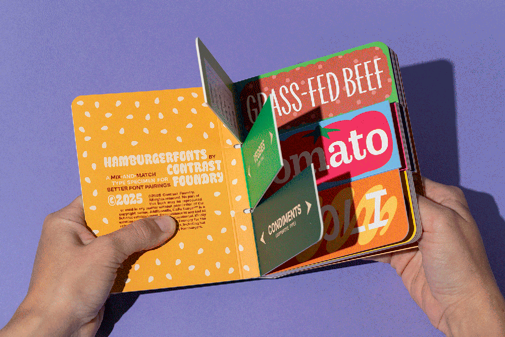Based on layering ingredients as you would when assembling the project’s namesake, proteins become display type, veggies form the body, and condiments add a little something on top as supporting type. The concept, designed by TOOOT’s Johnny Gage, Camille Gwise, and Giorgia Sage, isn’t simply about imagining your perfect burger, in theory; the piece is interactive, like an old-school children’s mix-and-match book.