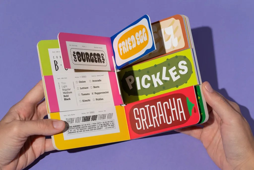 Bright and colorful illustrations, a collaboration between the TOOOT team and CoFo’s Egor Golovyrin and Nikita Sapozhkov, complement the typefaces. The burger story continues through the packaging, with the adorable, handheld-sized book presented in a burger-style wrap, enclosed with a sticker.