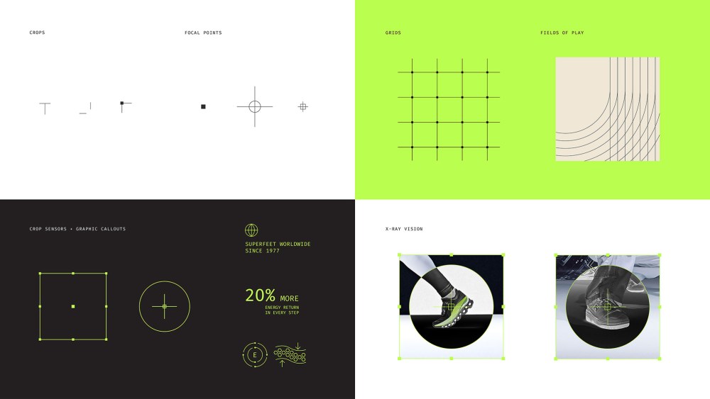Inspired by the [Superfeet’s] own testing labs, the new identity leans into a vernacular of performance, gridlines, x-ray overlays, dot matrices, and typographic notes that feel pulled straight from a biomechanical report.